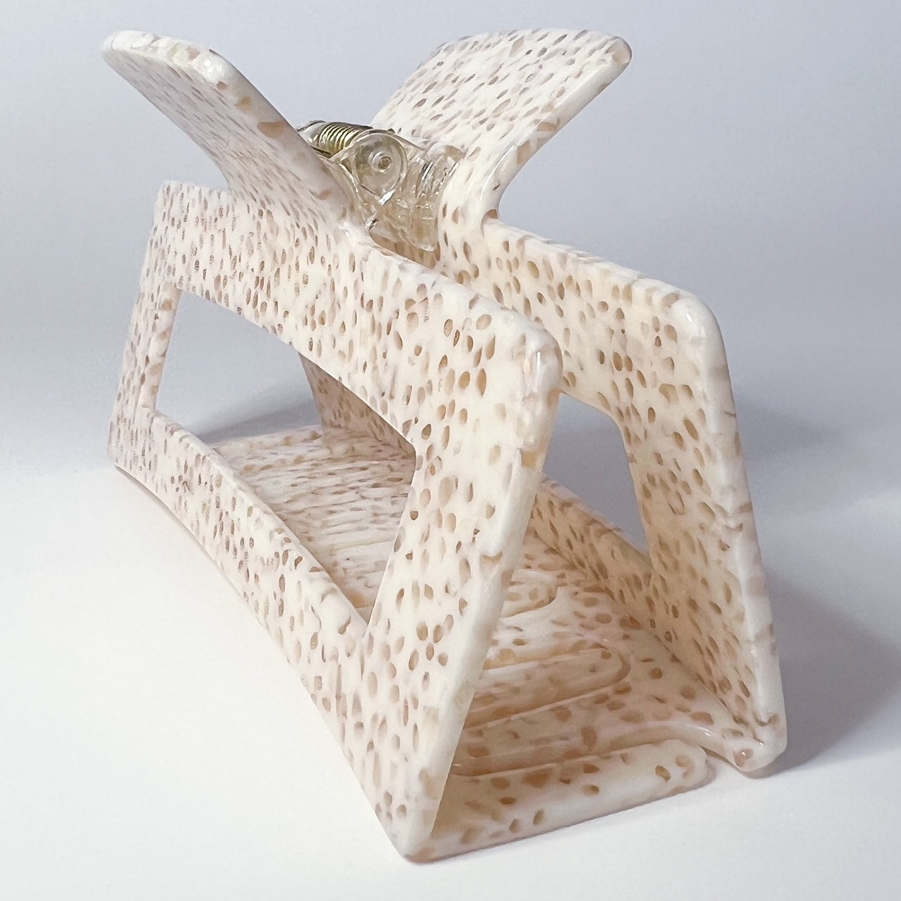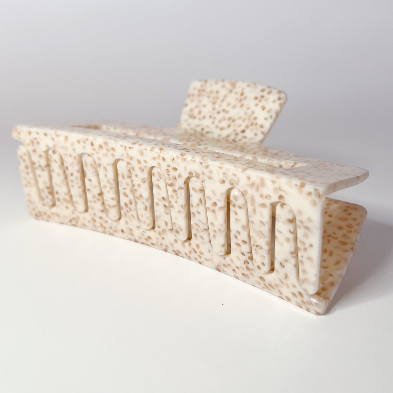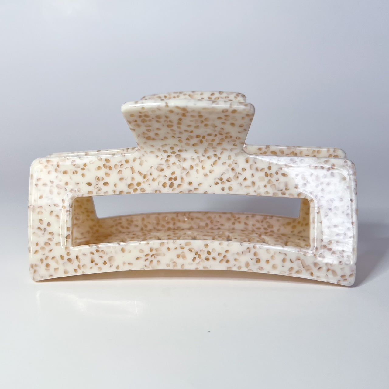 So many times I've heard the woes of thick haired girls never being able to wear claw clips, so here they are! These clips are made of cellulose acetate and are way more durable than your average claw clip. These are not plastic. You will notice the difference immediately! (No more broken prongs over here!). This one is beige with light spots.