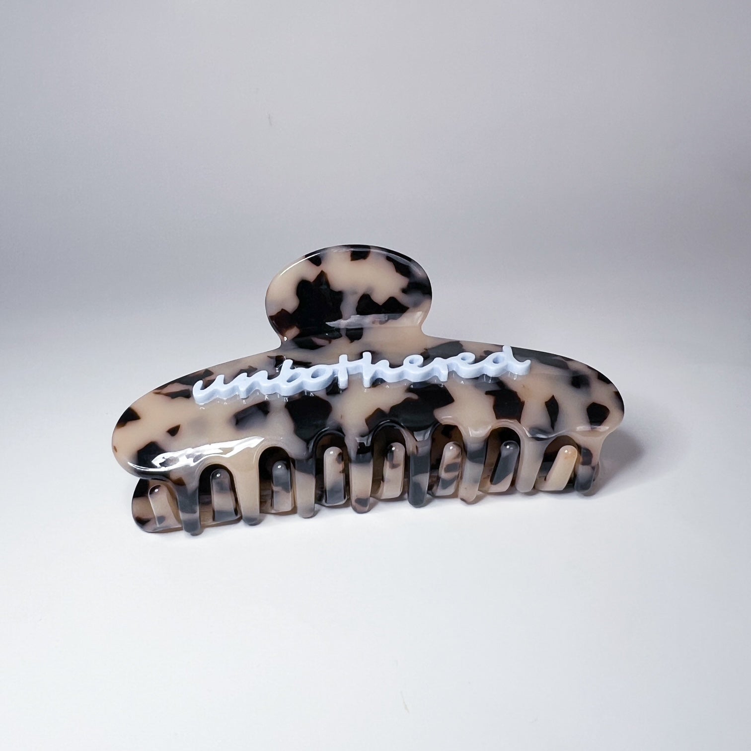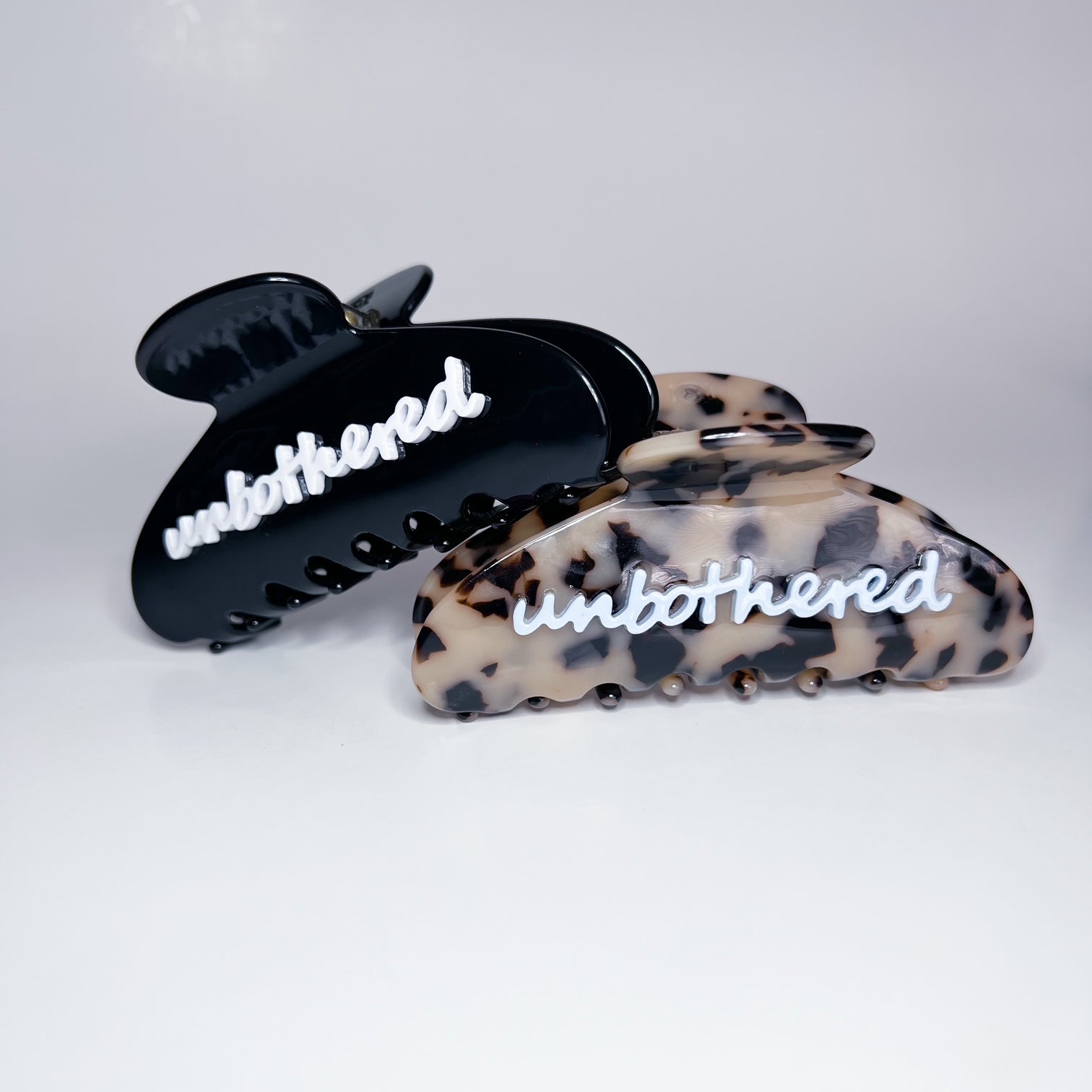 These clips are made of cellulose acetate and are way more durable than your average claw clip. These are not plastic. You will notice the difference immediately! (No more broken prongs over here!). This one comes in 2 colour ways and has the word "unbothered" scripted on both sides.